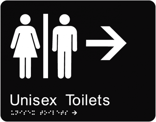 Braille Translation: Unisex Toilets (Right Arrow)Substrate: Black acrylicFitted with Double Sided TapeSize: 235 x 180 x 3mm