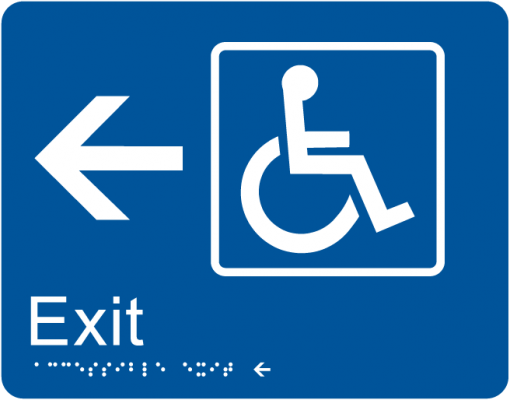 Braille Translation: Accessible Exit (Left Arrow)Blue acrylicFitted with Double Sided TapeSize: 350 x 130 x 3mm