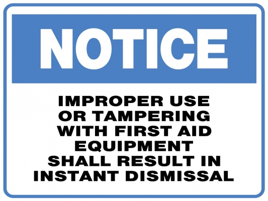 NOTICE IMPROPER USE OR TAMPERING WITH FIRST AID EQUIPMENT SHALL RESULT IN INSTANT DISMISSAL Product code: 3ABDF407-2651-BD49-88CC-ED89F8D9